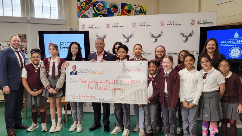 NUEVA YORK — El congresista Adriano Espaillat hizo entrega oficial de $500,000 en fondos federales a la escuela primaria e intermedia PS 171 Patrick Henry, ubicada en su distrito congresual. Los recursos serán destinados a la renovación de baños y otras instalaciones del plantel, en un proceso impulsado por los propios estudiantes de la institución.